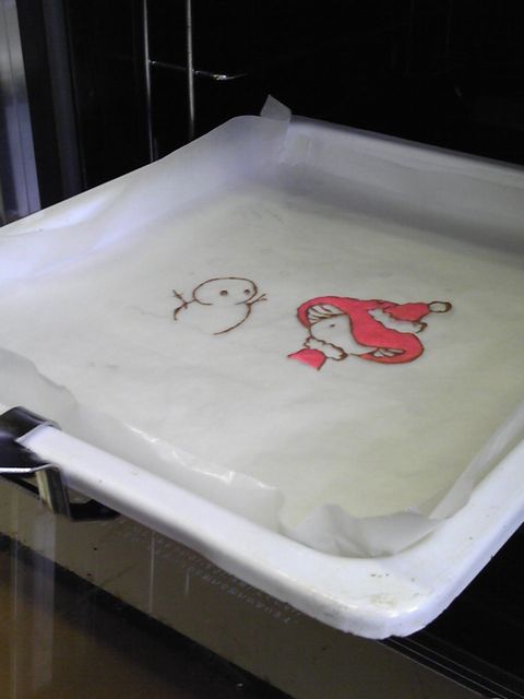 赤い部分は食紅、濃い茶色はココアで色付け。生地にはココアがちょっと混ざってます。